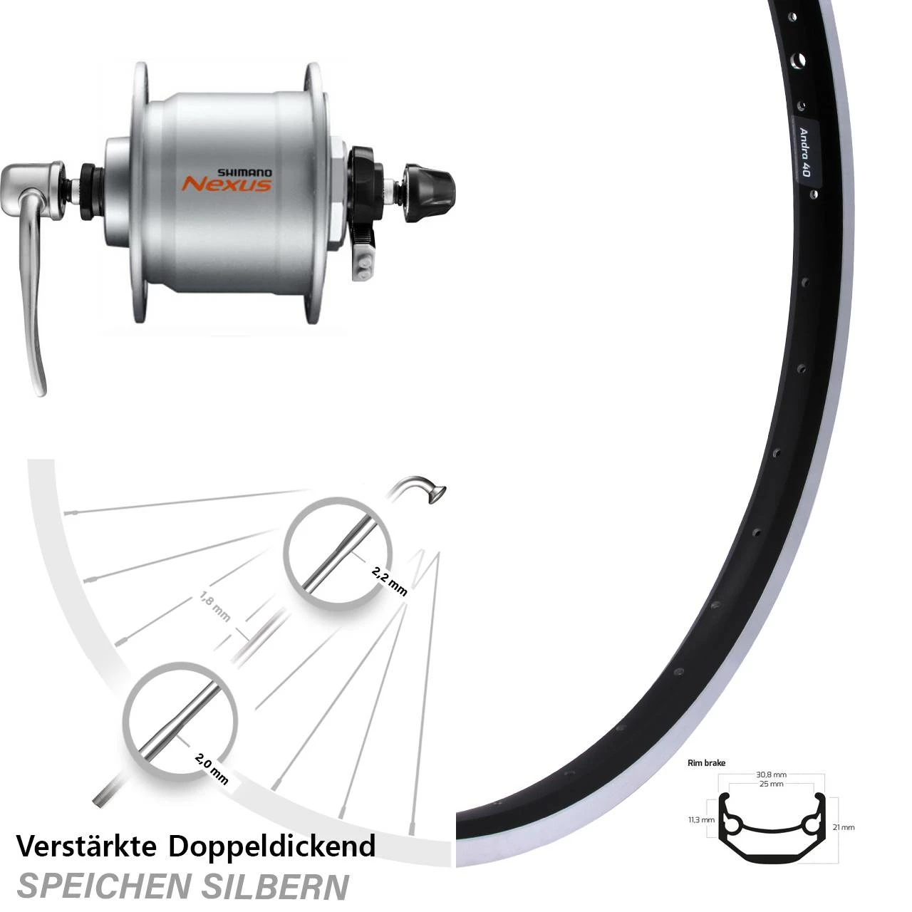 - Vorderrad 28 Zoll, 29 Zoll Ryde Andra 40 schwarz mit Nabendynamo Shimano Nexus DH-C3000-3N silbern