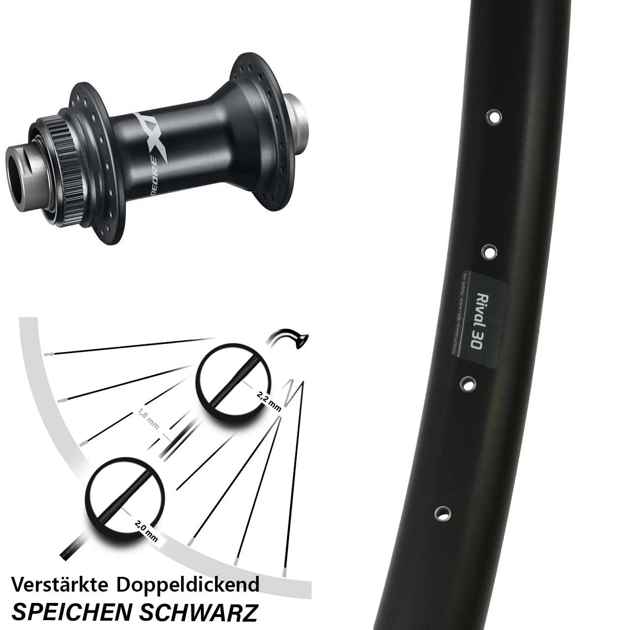 Technische Daten Vorderrad Ryde Rival 30 Disc schwarz mit Nabe Shimano Deore XT HB-M8110 schwarz
